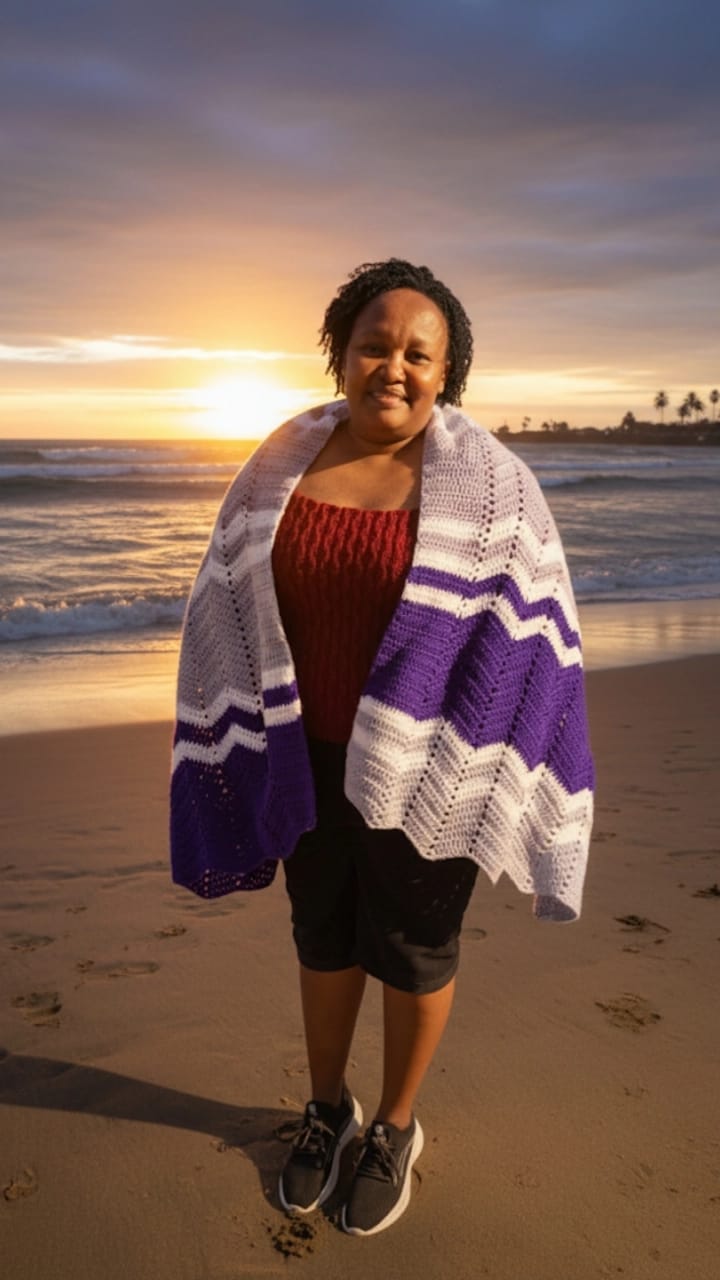 Wrap yourself in comfort and elegance with this soft, handmade crochet shawl featuring a bold chevron stripe design in rich purple and crisp white. Its generous size offers cozy warmth for evening strolls, beach days, church, or casual outings. Lightweight, stylish, and beautifully crafted, the perfect accessory to elevate your look in any season.
