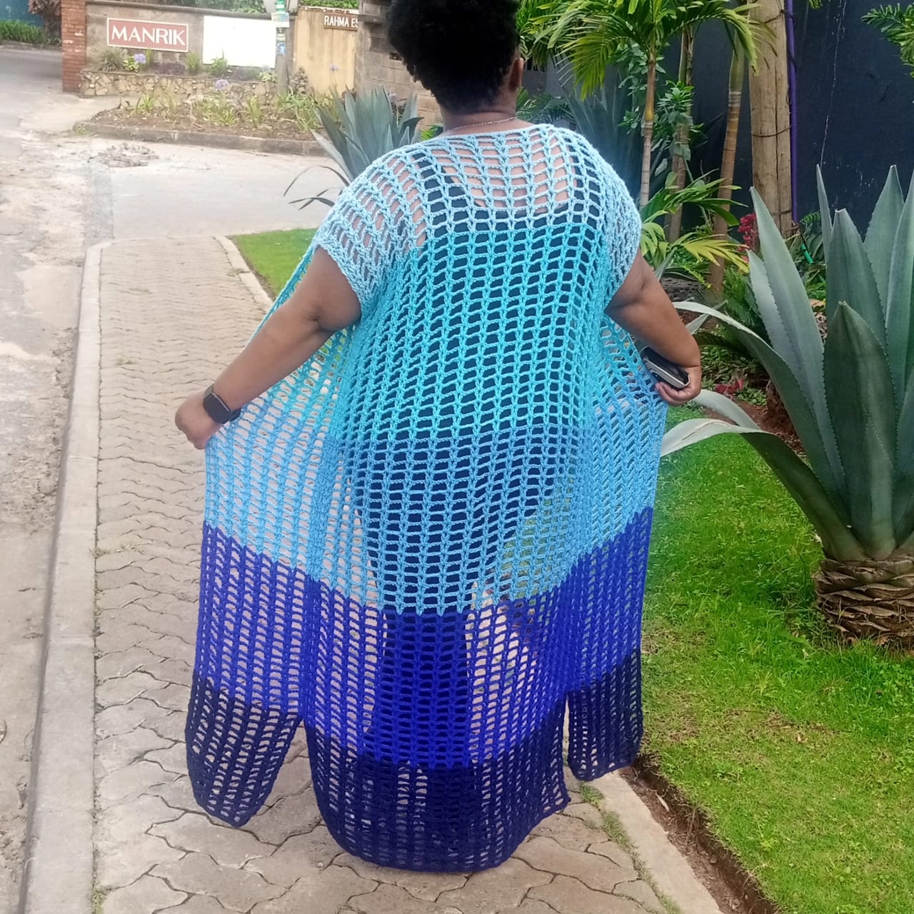 Make a statement in this stunning ombre crochet maxi cover-up, designed with a breezy open-mesh pattern for effortless movement and style. Blending beautiful shades of blue from light aqua to deep navy, this piece adds eye-catching elegance to any outfit. Perfect for beach days, vacations, poolside lounging, or layering over casual wear. Lightweight, comfortable, and handcrafted for a flawless fit that flows with you.
